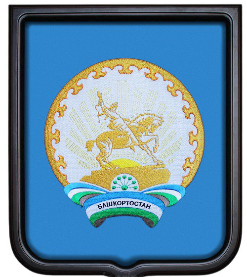 Герб Башкортостана 35х43 см, выполнен в виде вышивки на ткани. В качестве ткани используются сатен, флокированная замша, натуральный бархат или адверта. Ткань натягивается на щит из дерева с мягкой подложкой и заправляется в раму. Рама выполнена из бука, отделанного лаком под темное дерево.Форма герба 35х43 см - французский щит (прямоугольник с заострением в середине нижней части). На обороте имеется крепление «крокодил», с помощью которого герб можно удобно закрепить на стене .